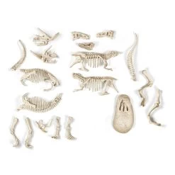 Comme un véritable petit scientifique, il creuse et trouve les restes fossiles de 2 redoutables dinosaures : le T-Rex et le Tricératops.