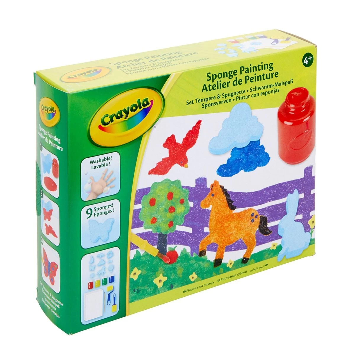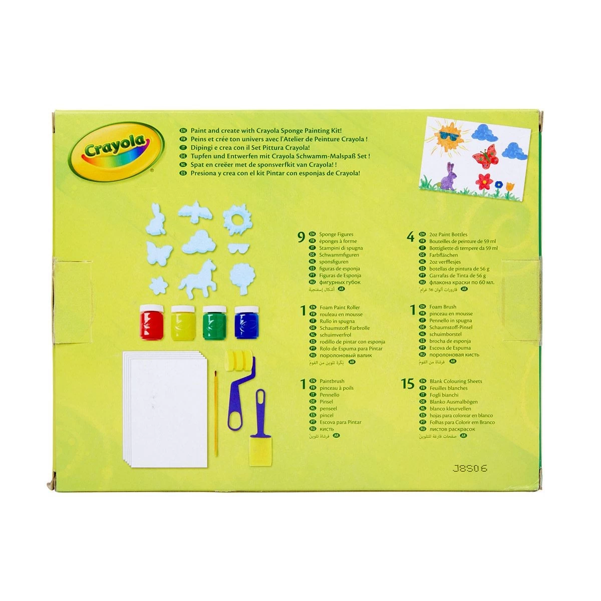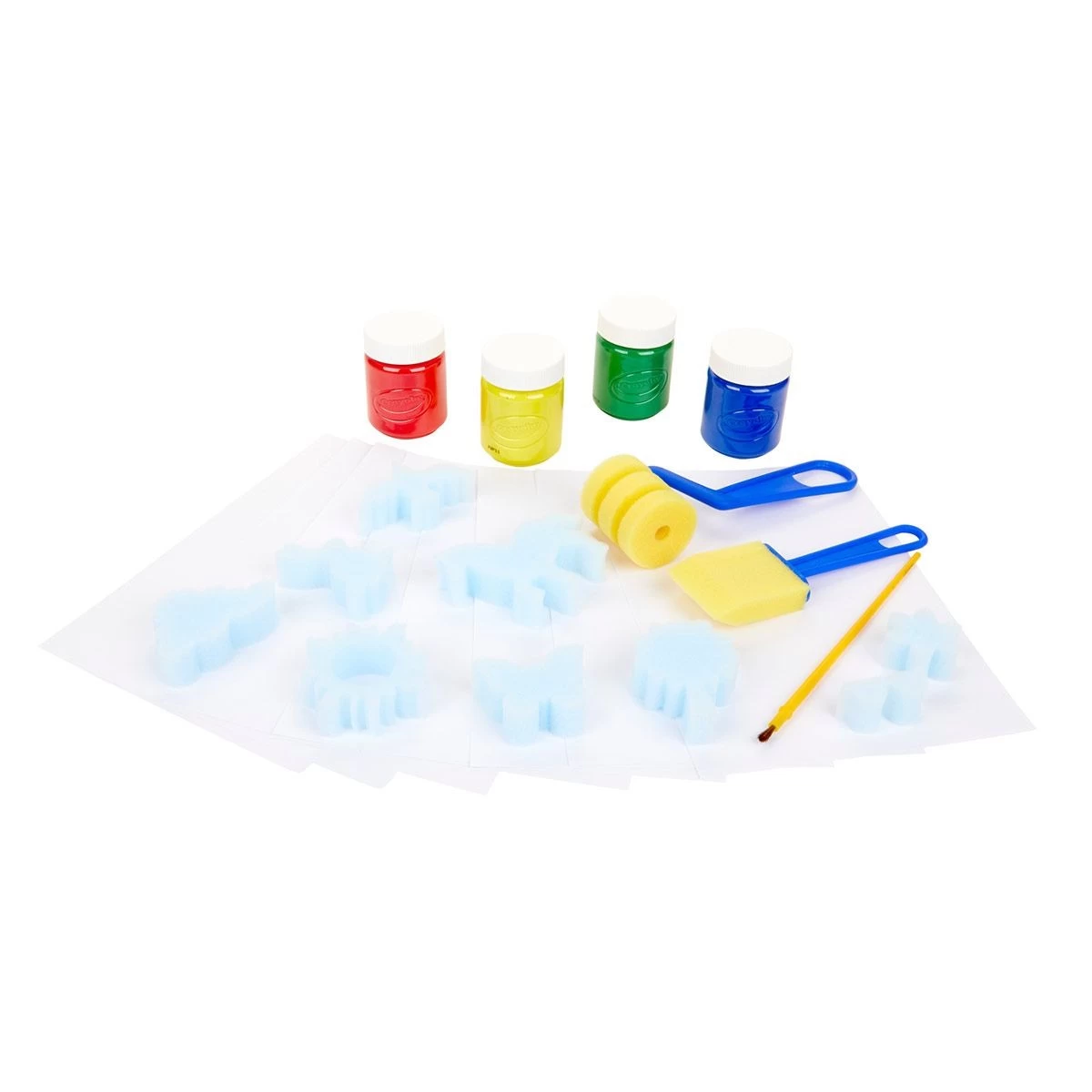 Contient : 15 feuilles blanches, 1 rouleau en mousse, 1 pinceau en mousse, 1 pinceau à poils, 8 éponges à forme, 4 bouteilles de peinture de 59 ml.