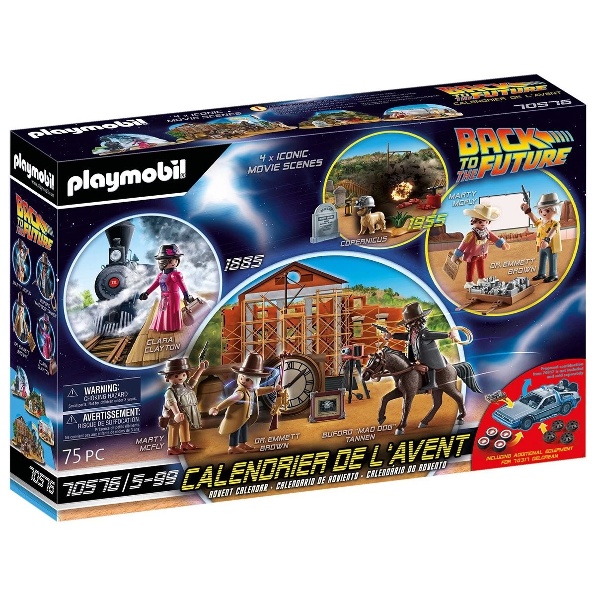 Cette année encore, les calendriers de l’Avent de PLAYMOBIL® permettront aux plus petits de patienter jusqu’à Noël. Les 24 petites fenêtres dissimulent des personnages et des accessoires PLAYMOBIL® pour s’amuser dans l’univers de Retour Vers Le Futur. Reconstituez de scènes cultes du troisième opus de Retour Vers Le Futur avec ce calendrier de l’Avent ! Les calendriers de l’Avent PLAYMOBIL comportent 24 fenêtres prémontées pour créer une mise en scène complète jusqu’à Noël.