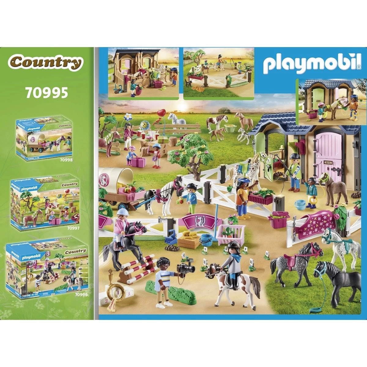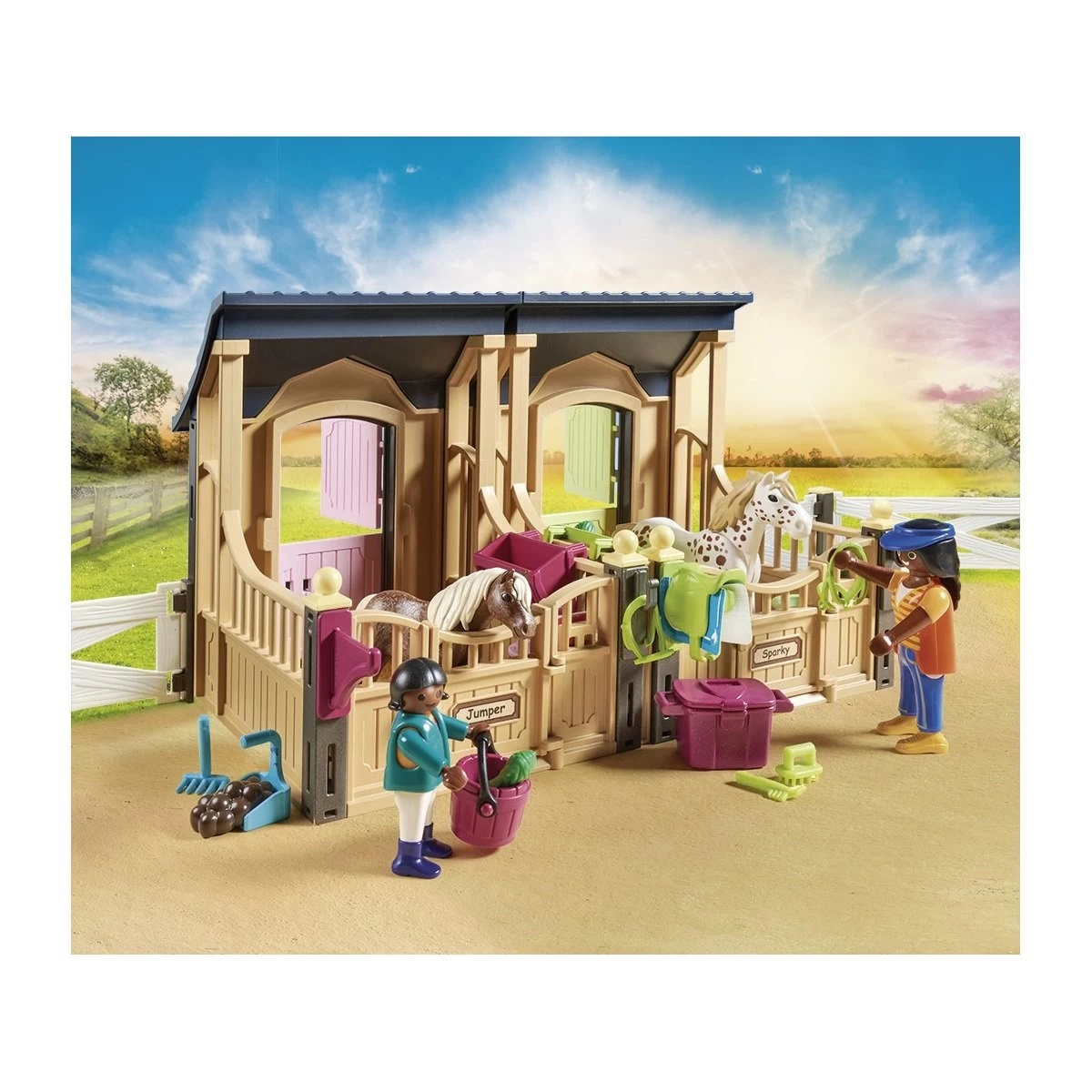 Le Centre d’entraînement équestre – Playmobil Country 70995 contient : 3 personnages, 1 cheval, 2 boxes et de nombreux accessoires.