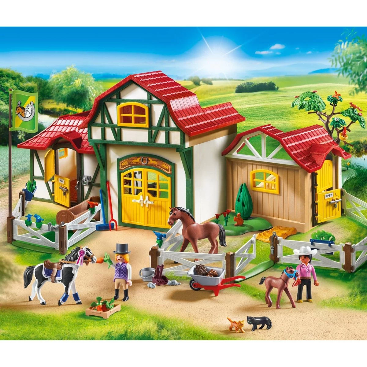 Contient deux personnages, deux chevaux, un poulain. Les deux boxes permettent d’accéder directement sur l’enclos extérieur. Des étagères, porte-selles et crochets sont disposés des deux côtés dans la partie centrale du bâtiment pour le rangement des licous, brides, selles et autres équipements. Les deux boxes de tailles différentes sont chacun équipés d’un abreuvoir, d’un râtelier et de sols recouverts de paille. Les portes de l’écurie peuvent être ouvertes vers l’extérieur et la porte de l’enclos extérieur, dans les deux directions. Une échelle mène au fenil. Une porte en deux parties dont l’élément inférieur peut être verrouillé permet de sortir dans le paddock voisin. Différents licous (6 en tout), selles (3 en tout) et brides (3 en tout) sont disponibles pour les chevaux. Les licous fournis permettent de fixer les rubans de tournoi (2 en tout) et rubans décoratifs (4 en tout). Races fournies : Tinker et Trakehner (avec poulain). L’étiquette jointe permet à l’enfant de décider lui-même s’il souhaite garder le nom donné au cheval ou écrire le nom de son choix.