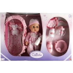 Le coffret contient un poupon de 30 cm, un couffin pour le transporter partout avec soi et 11 accessoires pour le repas (bavoir, biberon, assiette, cuillère, tasse…).