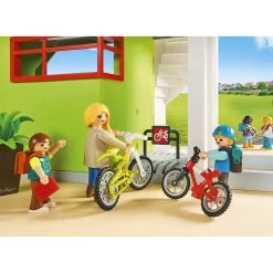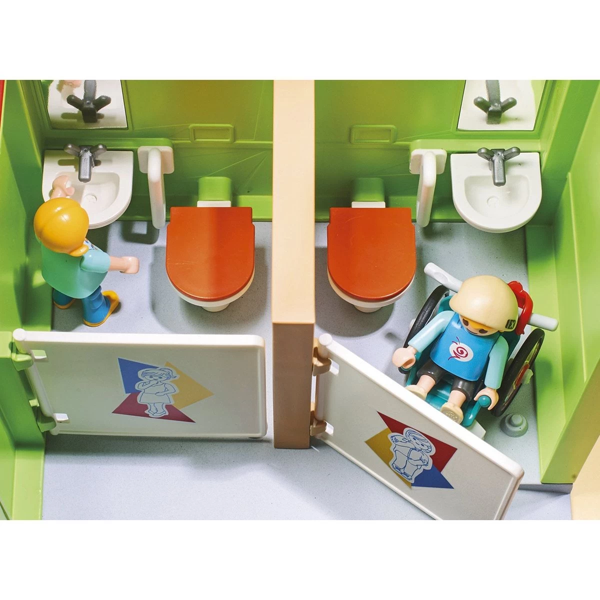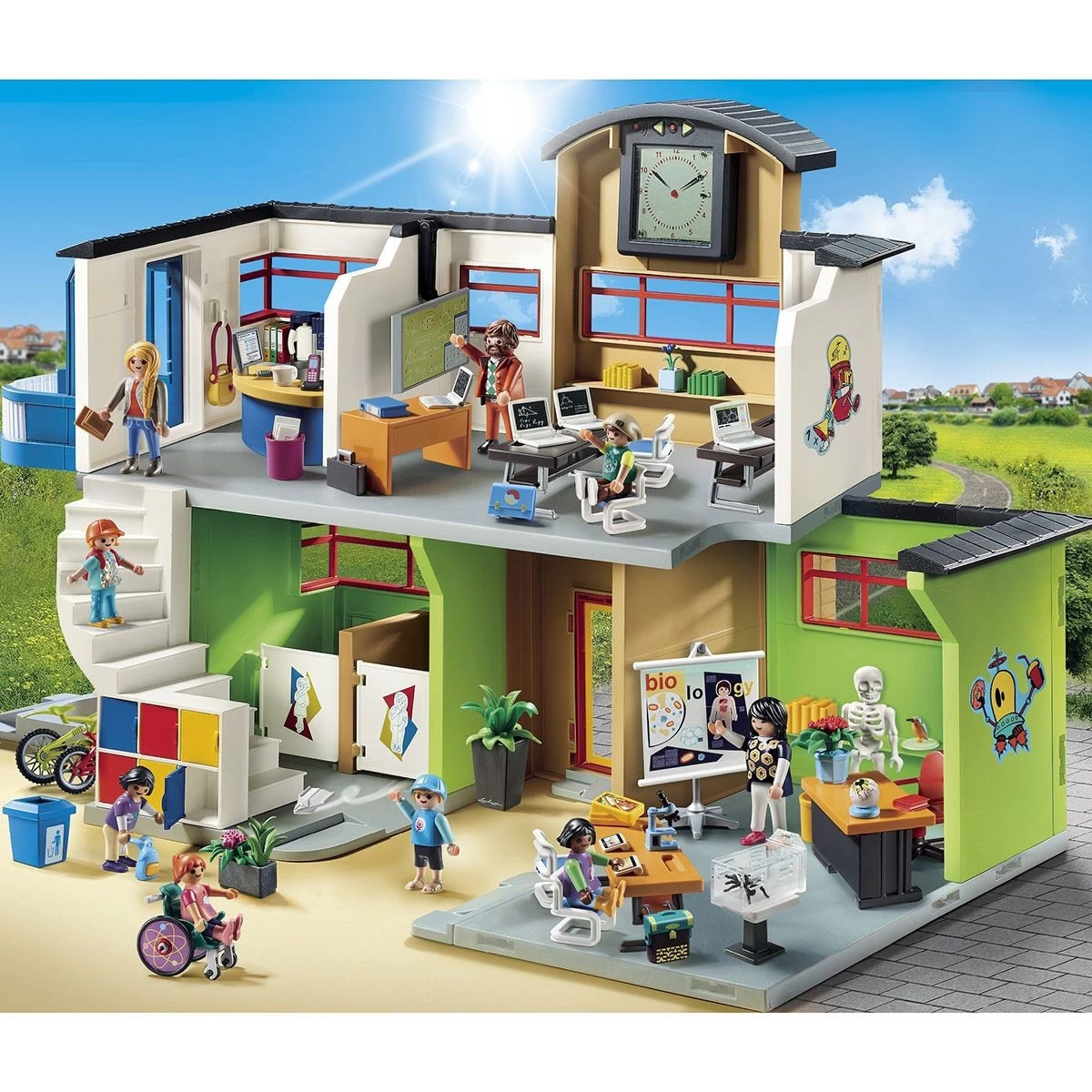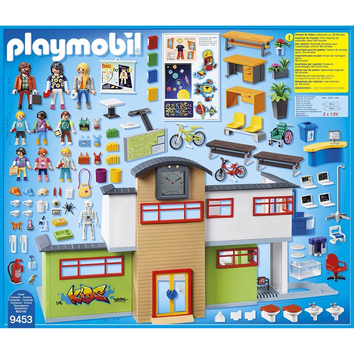 Contient 9 personnages, 1 bâtiment avec effets sonores (sonnerie des classes), du mobilier (bureaux, chaises, toilettes, évier…) et de très nombreux accessoires (vélos, fauteuil roulant, ordinateurs, sacs, livres, tableaux, autocollants, tasses, squelette…). L’école est composée de 2 salles de classes, de 2 toilettes, d’un escalier et d’un ascenseur. La salle de classe du premier étage a un tableau mobile et interactif fixé au mur. Les murs intérieur et extérieur du bâtiment peuvent être décorés avec les étiquettes incluses. Les cartables peuvent se ranger dans les casiers. Les 2 toilettes sont assez grandes pour le fauteuil roulant et accessibles par une rampe. L’ascenseur est également accessible par une rampe au rez-de-chaussée et disponible pour les utilisateurs de fauteuils roulants.