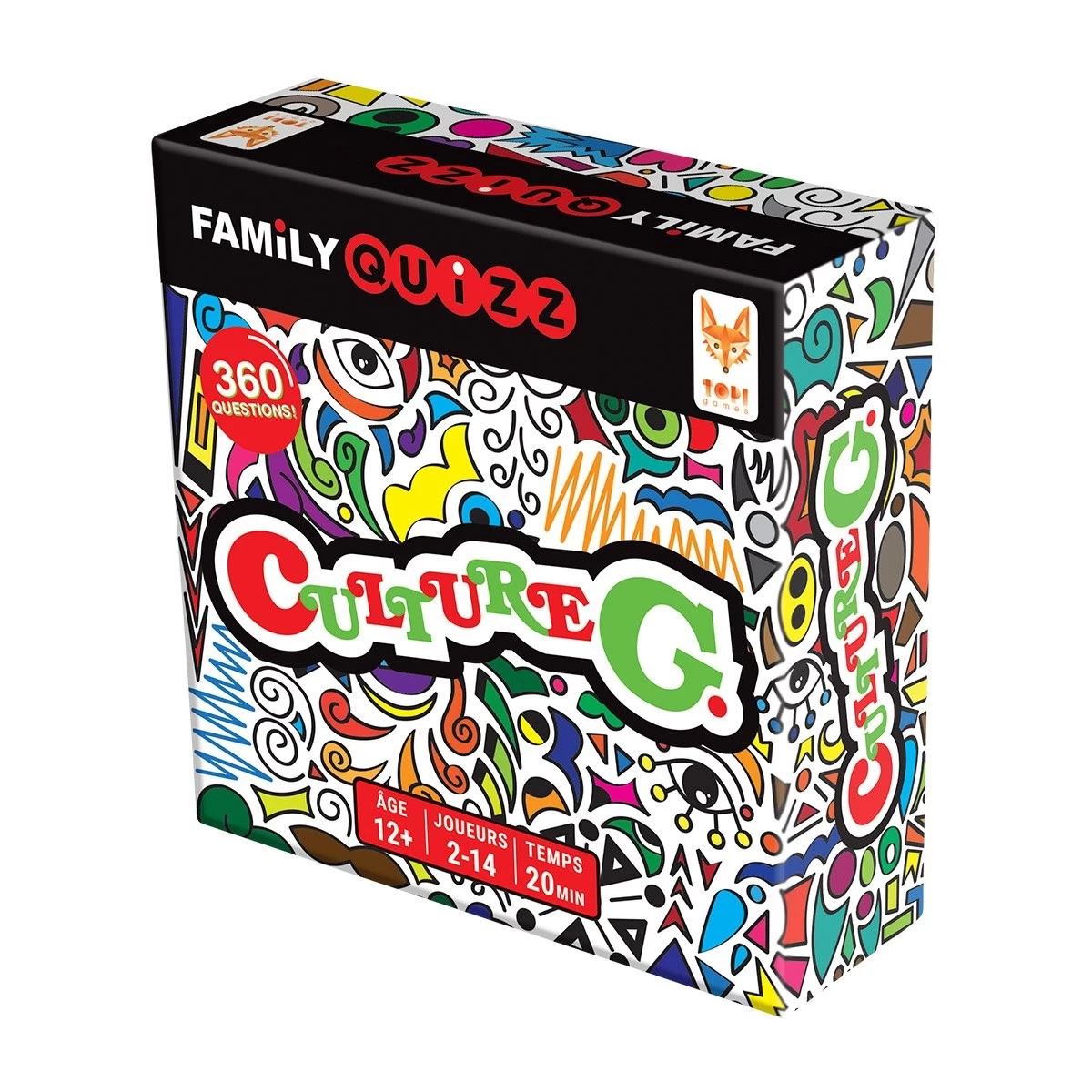 Family Quizz Culture G de Topi Games, c’est le jeu pour les passionnés d’Art en tout genre, du jeu vidéo à la sculpture, en passant par les arts de la scène et bien d’autres encore. Qui incarne le loup de Wall street ? De quelle couleur sont les minions ? Dans quel quartier de New York se déroule Friends ? Quel film révéla la chanteuse Louane ? Qui sont les 3 frères ? Lancez le dé et testez vos connaissances en culture générale et devenez incollable sur plus de 10 arts ! Un jeu idéal pour jouer en famille ou entre amis !