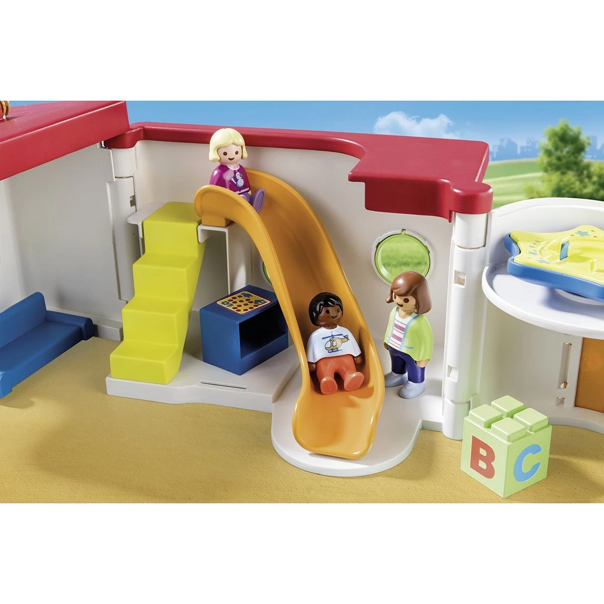 On s’amuse bien avec la garderie transportable Playmobil 1.2.3 70399 ! Les enfants jouent, s’amusent, font de la balançoire, du toboggan et plus encore. Un tourniquet se situe sur le toit de l’entrée et un personnage peut s’y installer ou être utilisé seul, à l’extérieur de la garderie, en le décrochant.