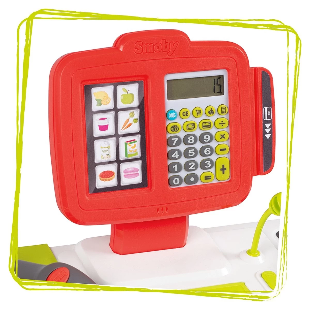 La caisse enregistreuse possède 1 tiroir-caisse, 1 calculatrice avec écran LCD, 1 micro factice et 1 lecteur de carte bancaire.