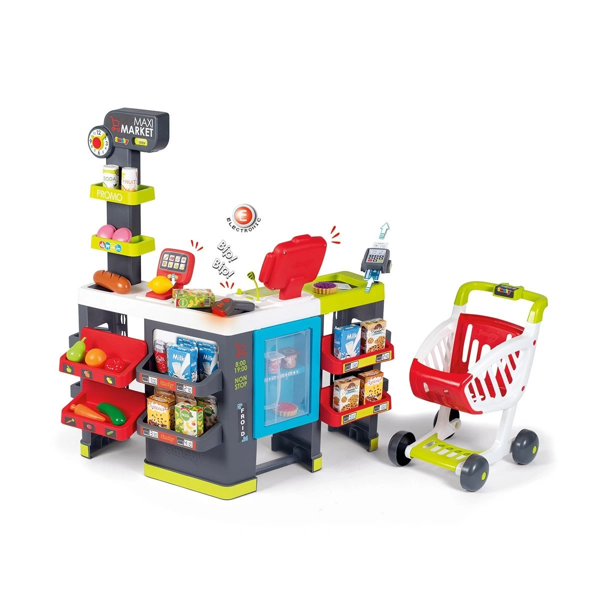 De nombreux accessoires sont inclus pour agrémenter les fonctions de jeu : 8 boîtes factices (céréales, pâtes, cookies, lait), 2 canettes, 2 yaourts, 6 fruits et légumes, 2 macarons, 2 tartelettes, 1 pain, 1 lecteur de code-barres électronique avec son et lumière, 4 tickets de caisse, 1 carte de crédit, 9 pièces, et 12 billets.