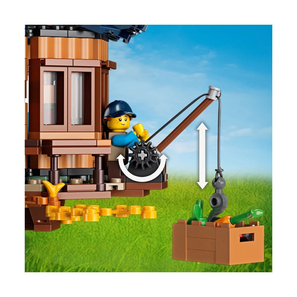Ce modèle présente de nombreuses fonctionnalités incitant au jeu, telles qu’une table et des chaises de pique-nique à construire, une balançoire, un feu de camp, une carte au trésor et une pierre précieuse cachée pour organiser une chasse au trésor, ainsi qu’un treuil qui fonctionne, fixé au balcon de la chambre parentale.