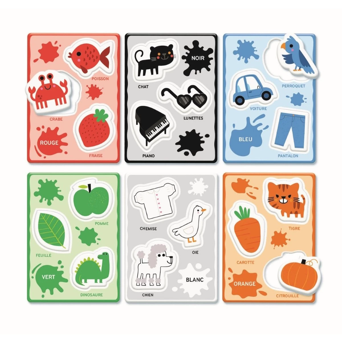 Le jeu contient de grandes planches en carton dans lesquelles insérer de nombreux sujets en fonction de la couleur représentée.