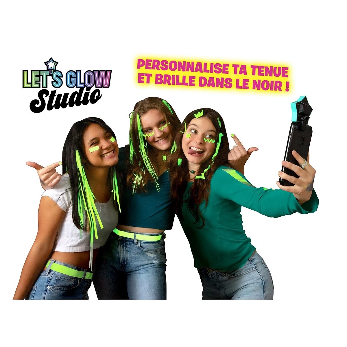 Contenu du coffret Let’s Glow Studio : Une pince lumineuse à LED en forme d’étoile avec sa télécommande et son cordon micro-USB, plus de 20 m de tissu réfléchissant de 3 largeurs différentes, 6 barrettes à cheveux, 1 paire de lunettes « shutter shades », 3 planches de stickers réfléchissants,10 ongles adhésifs réfléchissants, 3 pochoirs et 1 guide.