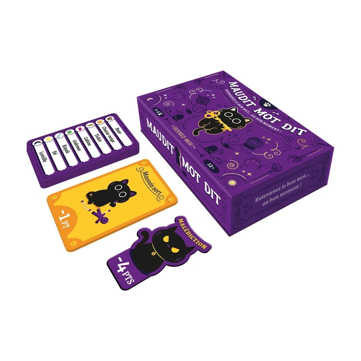 Contenu de la boite de jeu : 110 cartes Mots, 10 cartes Mauvais Sort, 1 tuile Malédiction et 1 livret de règle.