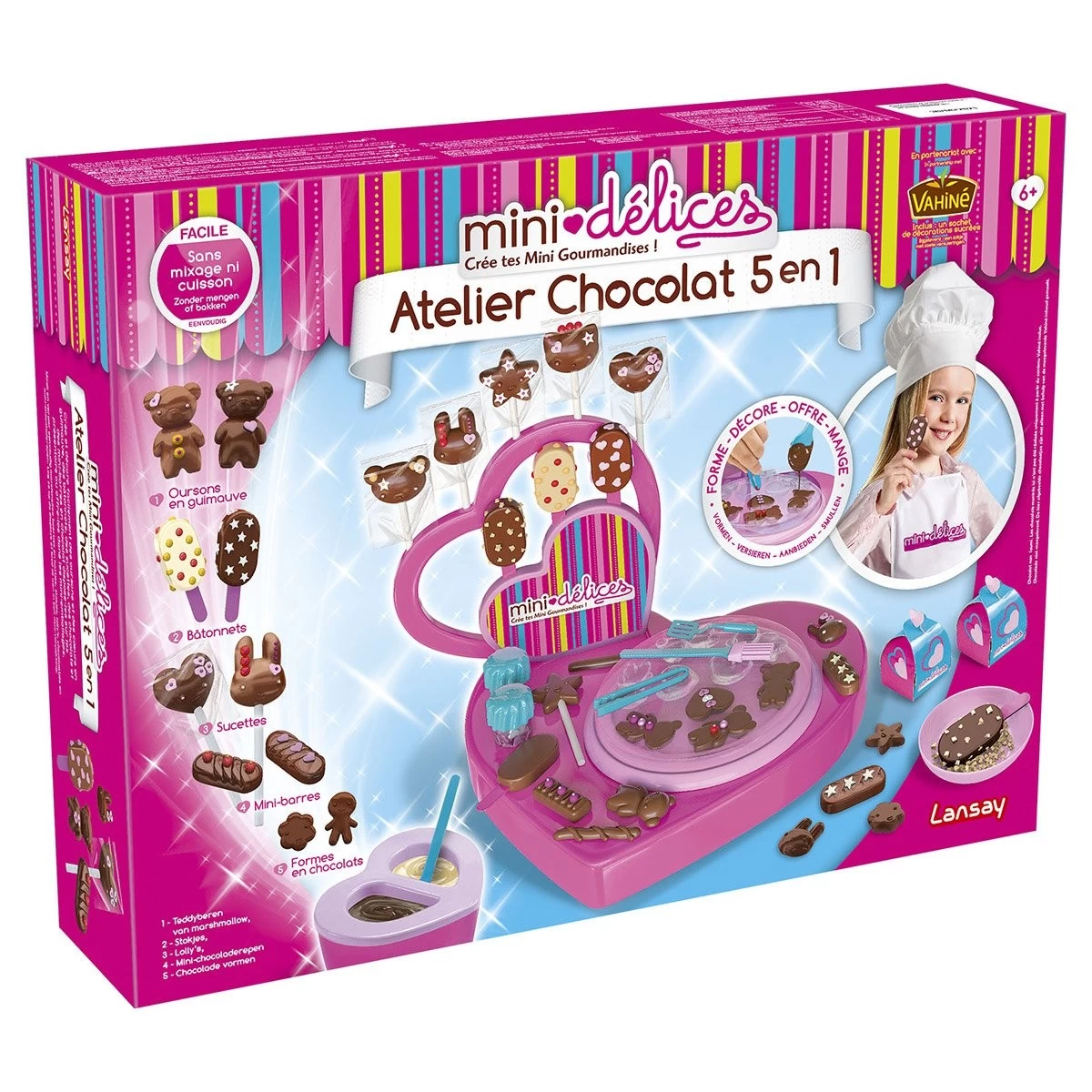 Mini Délices Mon Super Atelier Chocolat 5 en 1 de Lansay est un atelier complet pour créer facilement 5 types de gourmandises en chocolat : des oursons en guimauve, des bâtonnets, des sucettes, des chocolats et des mini-barres en chocolat.