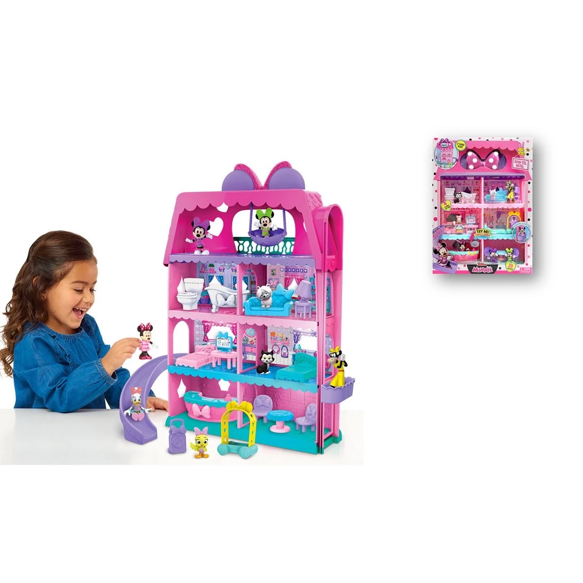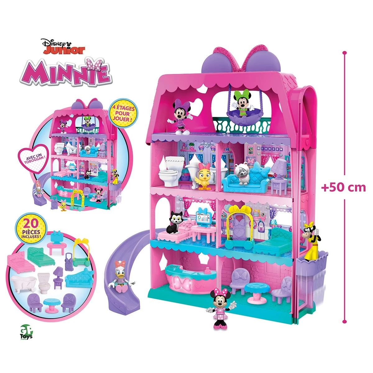 Les fonctionnalités de l’hôtel de Minnie : Sonore & Lumineux. 4 étages & 7 chambres. Ascenseur & toboggan. Près de 60 cm de haut. 2 faces pour jouer.