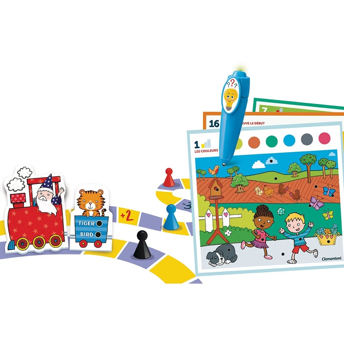 Le coffret compte aussi un jeu de l’oie pour s’amuser et apprendre à compter ainsi qu’un petit train coloré composé de pièces à emboîter.