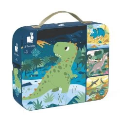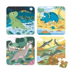 Le coffret Puzzles Evolutifs Dinosaures de la marque Janod propose 4 puzzles évolutifs en carton de 6, 9, 12 et 16 pièces sur le thème des dinosaures !