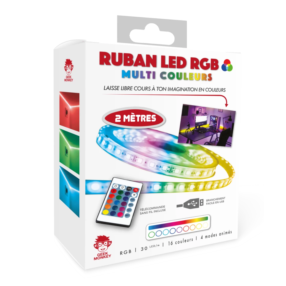 Le ruban LED mesure 2 mètres et est fournie avec sa télécommande infrarouge et un module RGB.