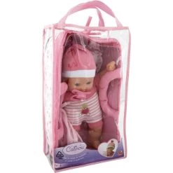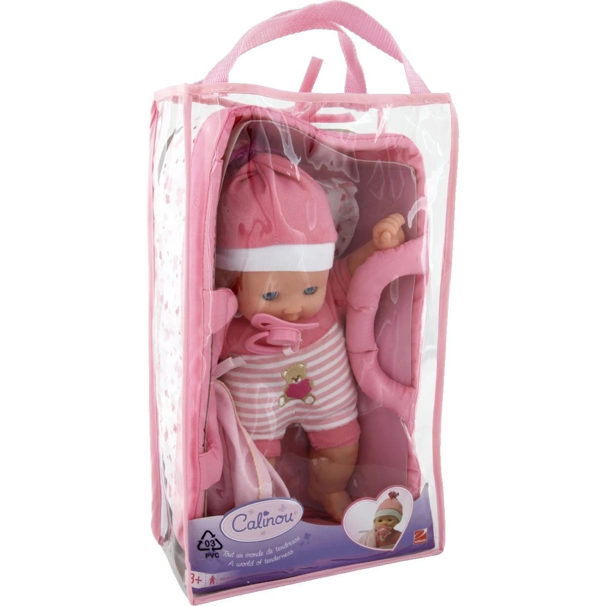 Ce joli sac bébé et son couffin signé Calinou permet à votre tout petit de faire une balade en compagnie de sa poupée Calinou pour lui faire découvrir le monde tout en prenant bien soin comme un grand ! Sac transparent contenant un poupon et un couffin de deux couleurs au choix rose ou bleu. Poupon de 30 cm de longueur.