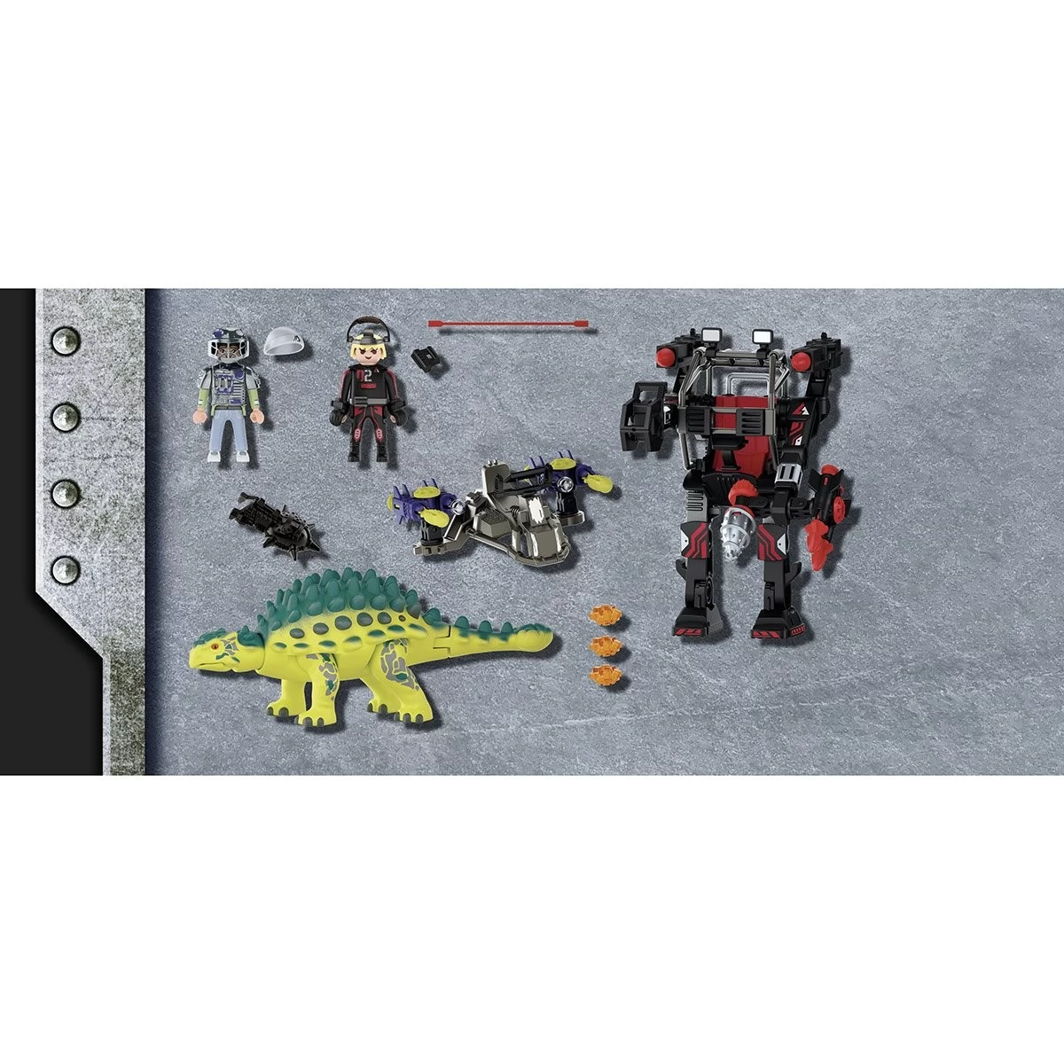Le dinosaure et le robot géant sont dotés de projectiles pour les combats à distance. Le robot géant dispose d’une pince et d’une foreuse sur ses bras. L’armure des personnages et celle du dinosaure sont amovibles. Un personnage peut s’installer dans le cokpit du robot géant et un autre sur le dos du Saichania afin de les piloter.