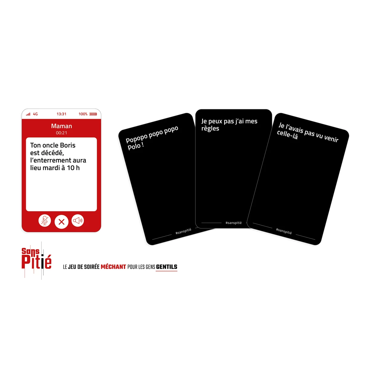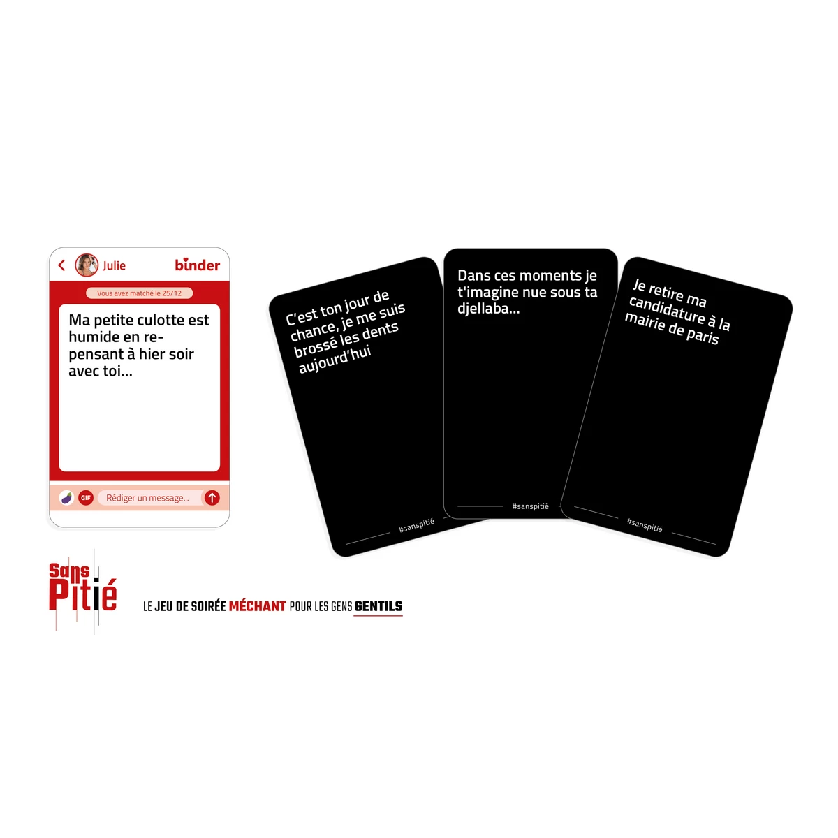 Comment jouer : à partir d’une première phrase, représentée par une carte posée par un joueur (le maître du jeu) les autres joueurs doivent choisir la réponse qui sera la plus à même de faire rire à partir des cartes dont ils disposent : ces cartes sont constituées d’un texte (la réponse) qui s’inscrit dans le mode de communication choisi [appli de rencontre, discussion informelle, post-it laissé sur le frigo, mail du boulot etc.].