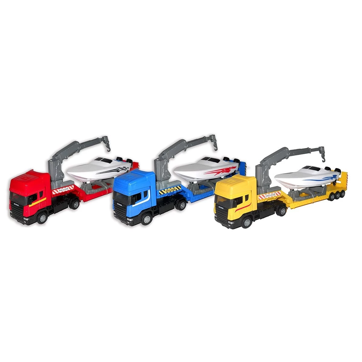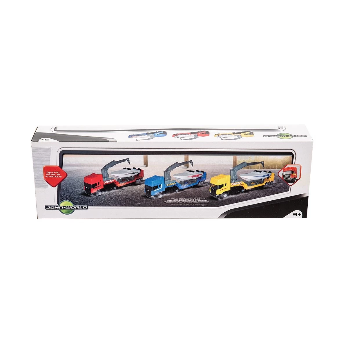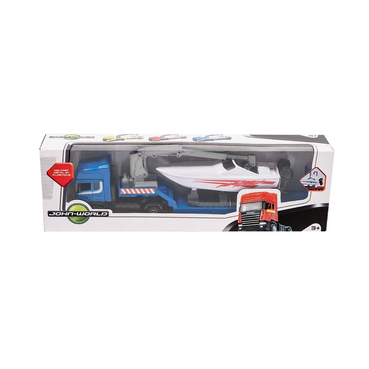 Avec ce camion semi-remorque licence SCANIA avec bateau de John World, votre enfant va pouvoir imaginer plein d’histoires.