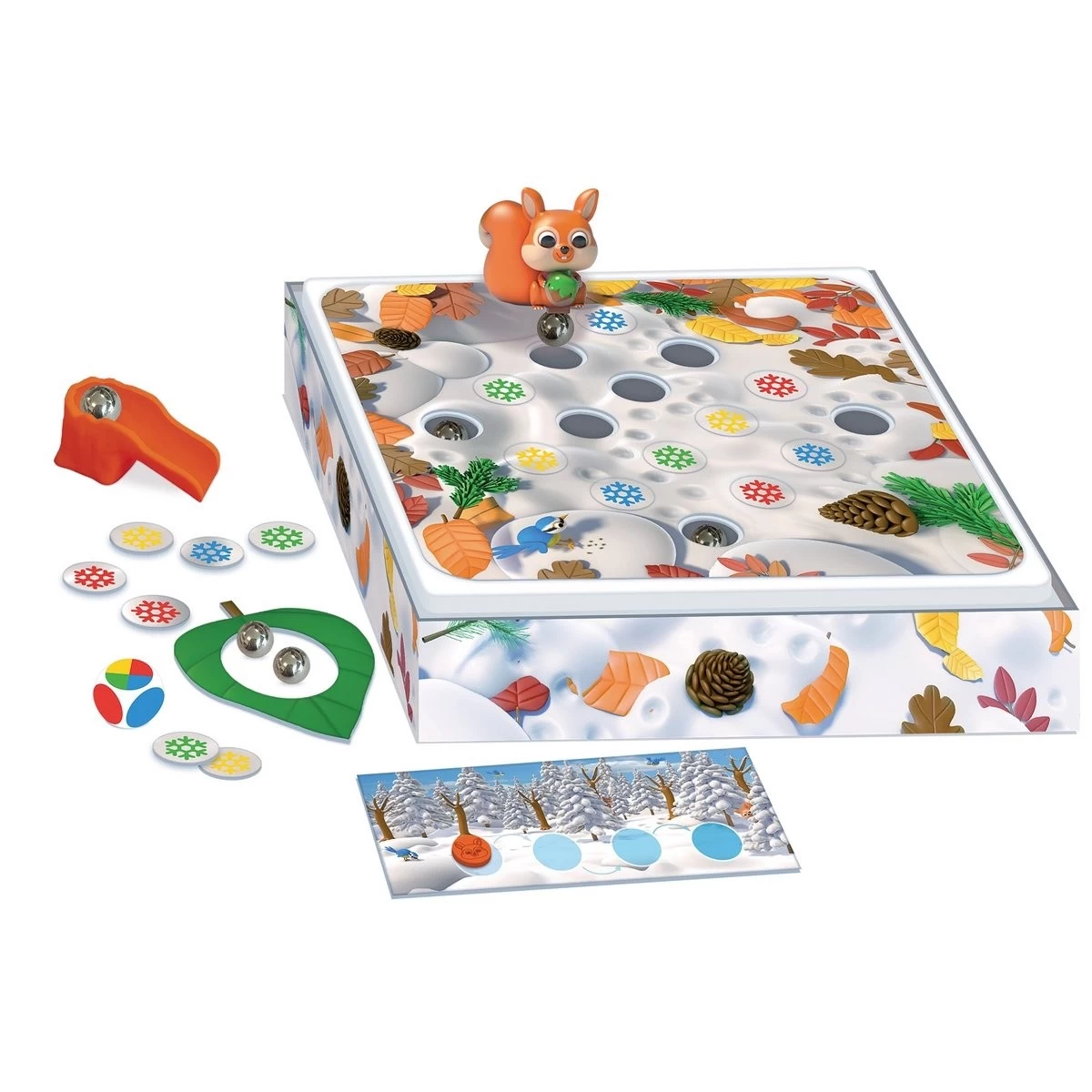 Contient : 1 plateau de jeu en 3D, 1 fiche des saisons, 1 écureuil aimanté en plastique, 1 tobogan à noisette en plastique, 6 noisettes (billes métalliques), 16 tuiles rondes, 2 jetons, 1 dé de couleur.