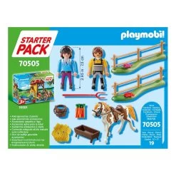 Avec le starter pack cavalière et palefrenier Playmobil Country 70505, découvre l’univers Playmobil ! Le cheval a faim, nettoyons son enclos pendant qu’il mange, puis partons en balade !