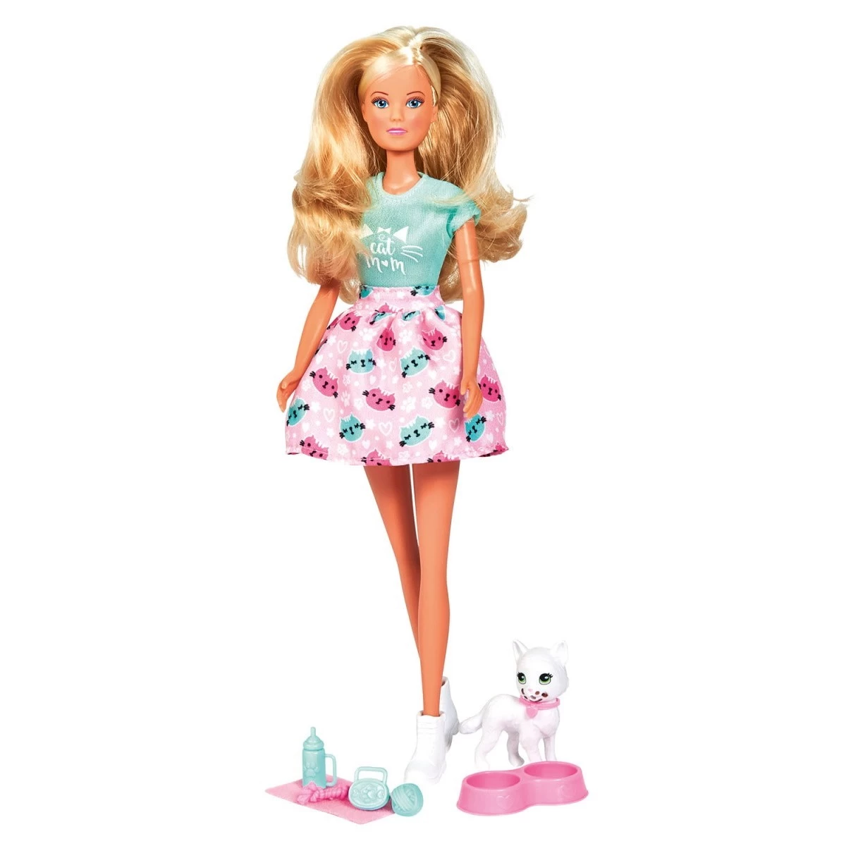 La poupée Steffi de 29 cm porte une tenue associée à son petit compagnon puisque son haut et sa jupe sont colorés et imprimés de motifs chats.