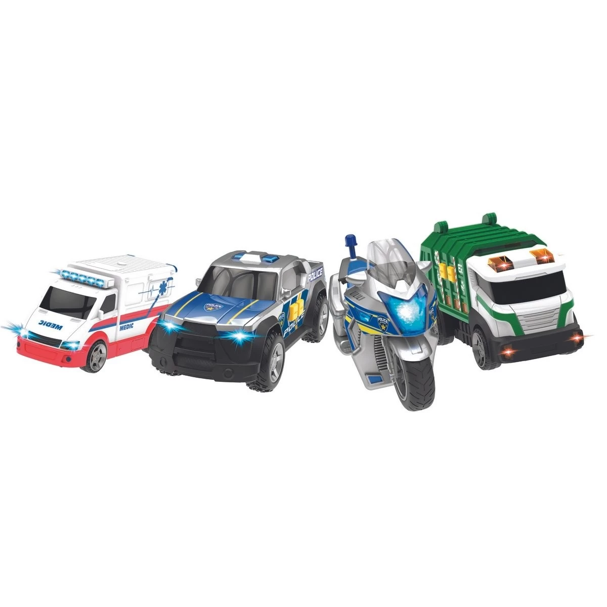 Ce coffret contient plusieurs véhicules sonores et lumineux de John World. 4 modèles assortis : camion poubelle, ambulance, moto et 4×4 de police. Votre enfant agrandit sa collection de véhicules et imagine plein d’aventures ! Fonctionne avec 3 piles bouton (AG13/LR44) incluses.