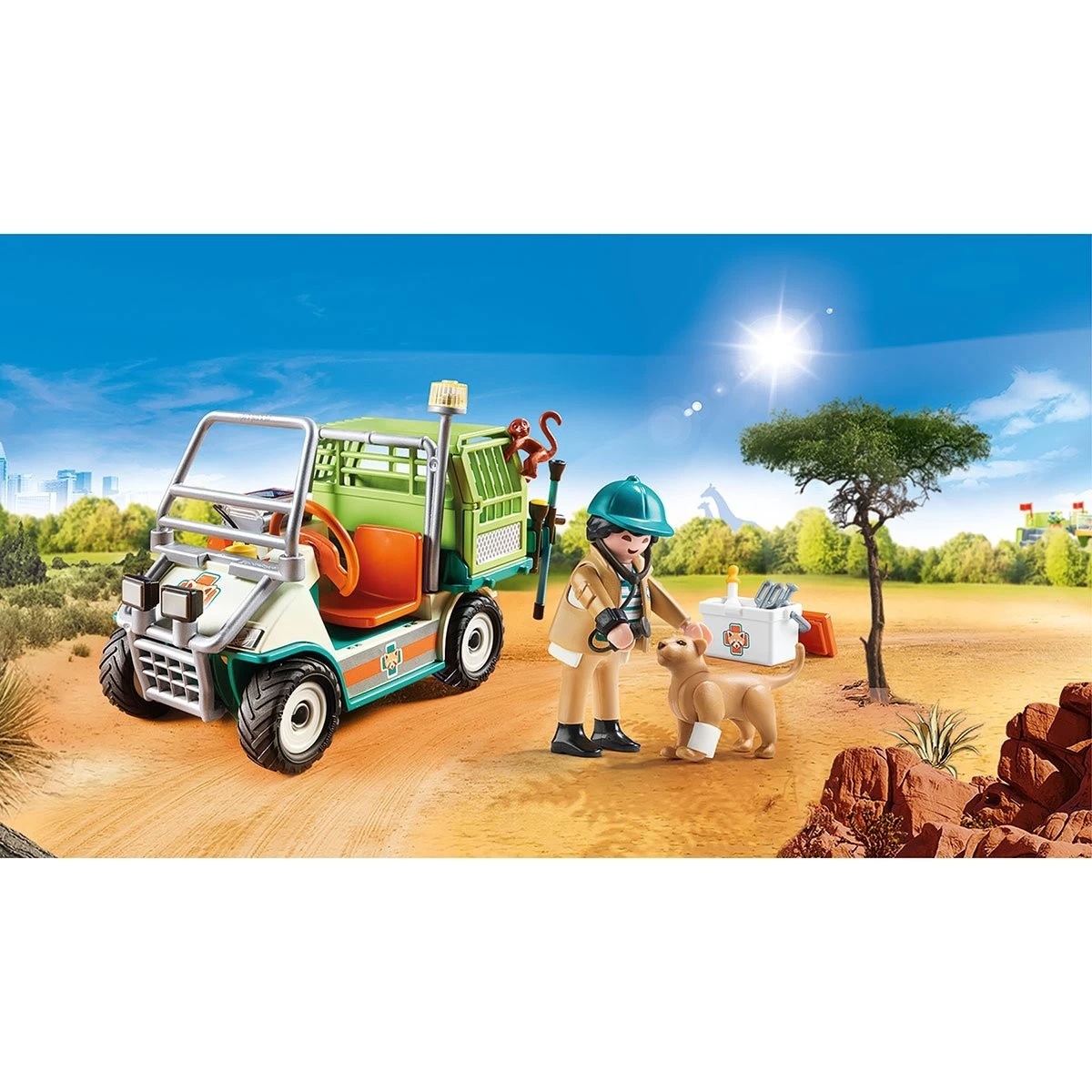 Avec son véhicule tout terrain, le vétérinaire peut se déplacer dans le grand parc animalier et soigner les animaux. Aujourd’hui, il doit s’occuper d’un petit lionceau qui a une blessure à une patte. Ensuite, il s’occupera du singe pour qu’il puisse de nouveau se balancer de liane en liane !